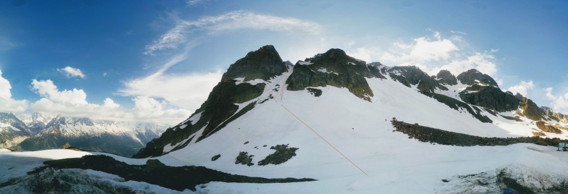 Nous entamons l’escalade vers 14h, si la première longueur est bien munies de pitons, la suite n’est plus du tout équipée, sauf quelques relais pas forcément complets… Assurez par 2 petits friends et mes 2 compères Marc et Romain qui ouvrent successivement, nous atteignons le sommet environ 3h30 plus tard. La vue est magnifique sur la vallée Chamonix, les Jorasses, les Drus et le Mont Blanc en face de nous. La descente se fait en 2 rappels et nous abandonnons une sangle pour inaugurer notre premier rappel sur becquet… La corde y restera coincée, Marc devra remonter… Nous sommes de retour au parking à 19h53, après 1h15 de course à bâtons rompus dans la descente.